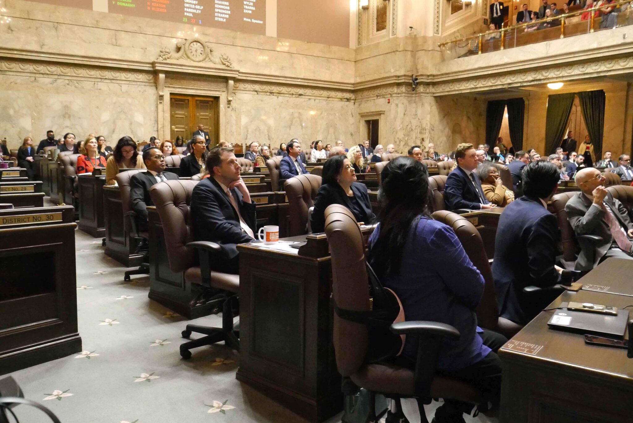 Democratic lawmakers watch as the roll is called on final passage of the income tax bill after nearly 25 hours of debate. (Photo by Bill Lucia, Washington State Standard.