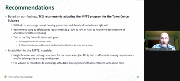 Adam Seidman briefed the council, via Zoom, about The Concord Group’s analysis of MFTE programs.