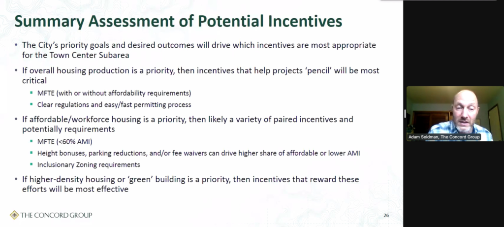 As a result, the city contracted with The Concord Group to assess various ways the city might incentivize the development of residential and commercial uses within the Town Center subarea, while also identifying ways to develop more affordable residential housing.