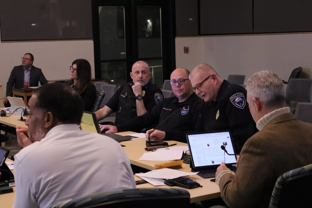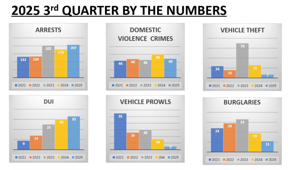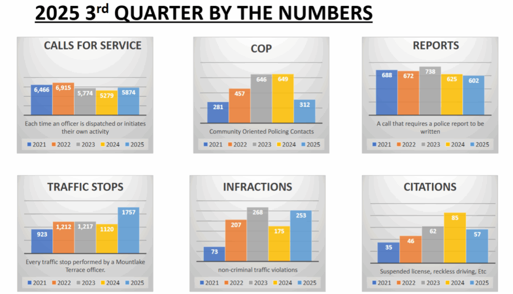 MLT Police Chief Pete Caw, Cmdr. Scott King and Cmdr. Mike Haynes presented to Council the 2025 third-quarter police report. The data compares the third quarters of each year since 2021. Haynes, who oversees the patrol division, highlighted the 2025 numbers: