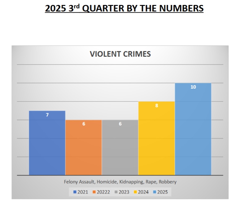 - Violent crimes went up slightly. Haynes said the low number of incidents made the percentage jump appear larger, adding that overall, the community remains “very safe.”