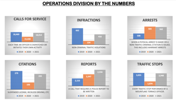 The council first reviewed the police department’s 2021 year-end report. Construction work at the Mountlake Terrace Police Department, as part of the Civic Campus redevelopment project, is now 98% completed and the new training room has been in use for several months. With some of the state’s COVID-19 restrictions oosened on in-person training, the department far exceeded the previous year’s total training hours.