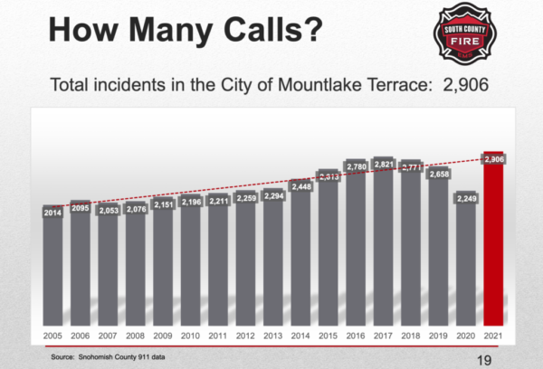 South County Fire also presented its annual report to the council. It was noted the agency recently added a 24-hour EMS unit and two additional firefighters at Station 20 in Edmonds to help alleviate increased calls for service throughout the area. A majority of the agency’s calls are for providing emergency medical services and 82% of incidents South County Fire responded to in Mountlake Terrace last year were dispatched as such.
