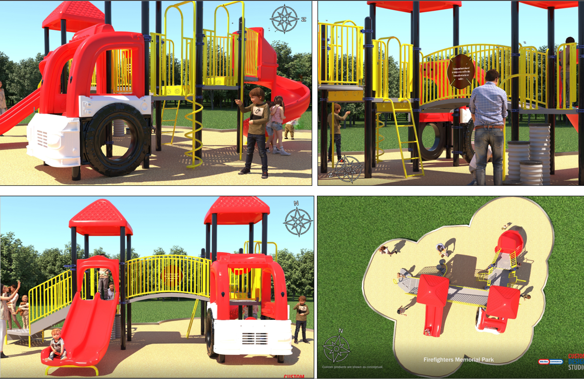 A: Features three slides, a climbing panel, tunnel, interactive play panels and shade. A shaded gray rectangle in the design indicates the location of the existing fire truck.