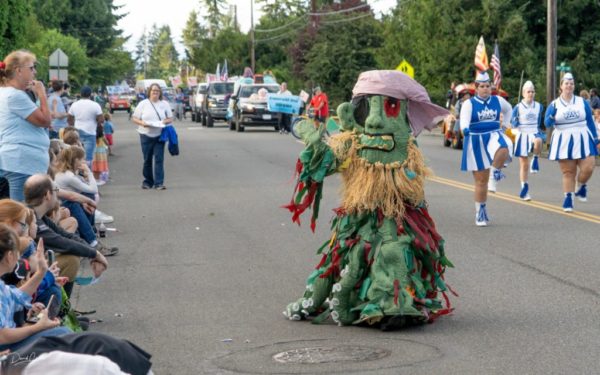 Following the parade, people gathered outside of Brier Grocery and Brier Pizza to see who would win a huge salmon, courtesy of QFC grocery. Others listened to a band playing outside Brier Pizza.