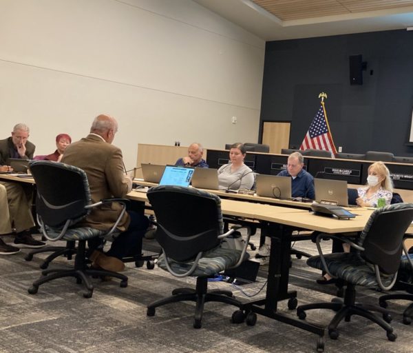 Mountlake Terrace city councilmembers listen as Interim Public Works Director Phil Williams, bottom left, presents the new Waste Management of Washington contract.