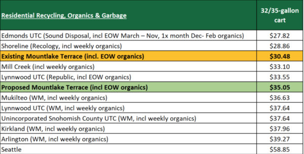 Williams then provided councilmembers with a graphic showing how both Mountlake Terrace’s current rates as well as the proposed new rates compare to other nearby cities. The city’s current rate is $30.48 per month, putting it as the third least-expensive city on the list. With a 15% increase, the monthly rate would be $35.05.