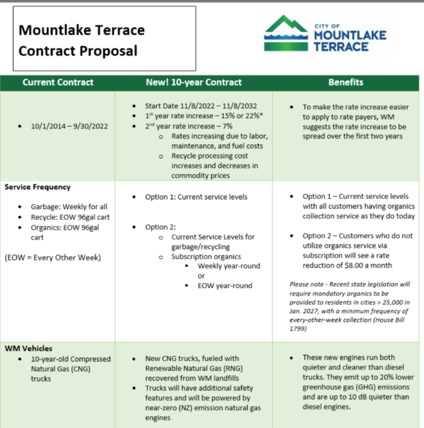 During the meeting, Williams talked about the city’s history with Waste Management, which has been providing solid waste collection services in Mountlake Terrace for about 35 years. In addition to discussing the terms of the new contract, he also discussed options the city could pursue in the future if it wanted to look at other solid waste collection alternatives.