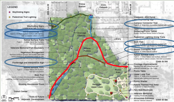 The project is split between two elements: the trails within Veterans Memorial Park and the plaza. The main trail, shown in red in the map below, runs from the light rail station — scheduled to open in 2024 — to 58th Avenue West. This will be a lighted asphalt pathway. The asphalt, lighted campus connector trail, shown at the upper right of the map in blue, runs north to the Civic Campus, will terminate just south of the police station. The north connector trail — shown in dark green at the top — will run from the Civic Campus over 60th Avenue West. That will also be asphalt and lighted.