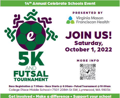 Yes, I want to support My MLTnews!Proudly sponsored by Virginia Mason Franciscan Health, the Celebrate Schools 5K and new futsal tournament, benefitting the Foundation for Edmonds School District, is happening this Saturday, Oct. 1. Now in its 14th year, it is guaranteed to be a fun time for the whole family! Read on to learn more.