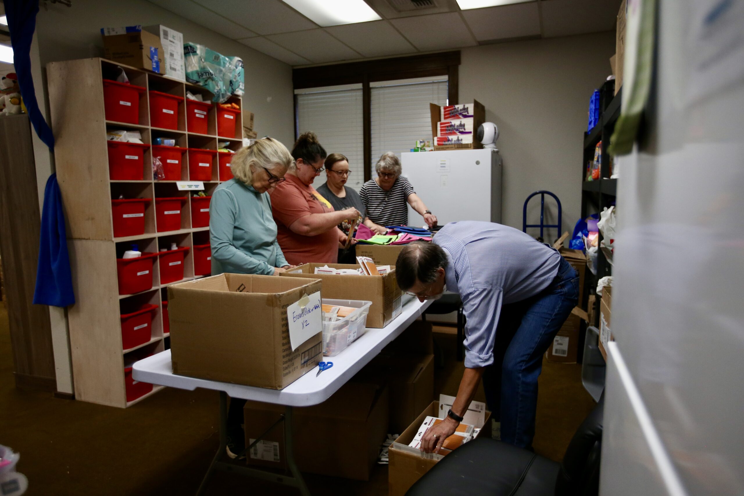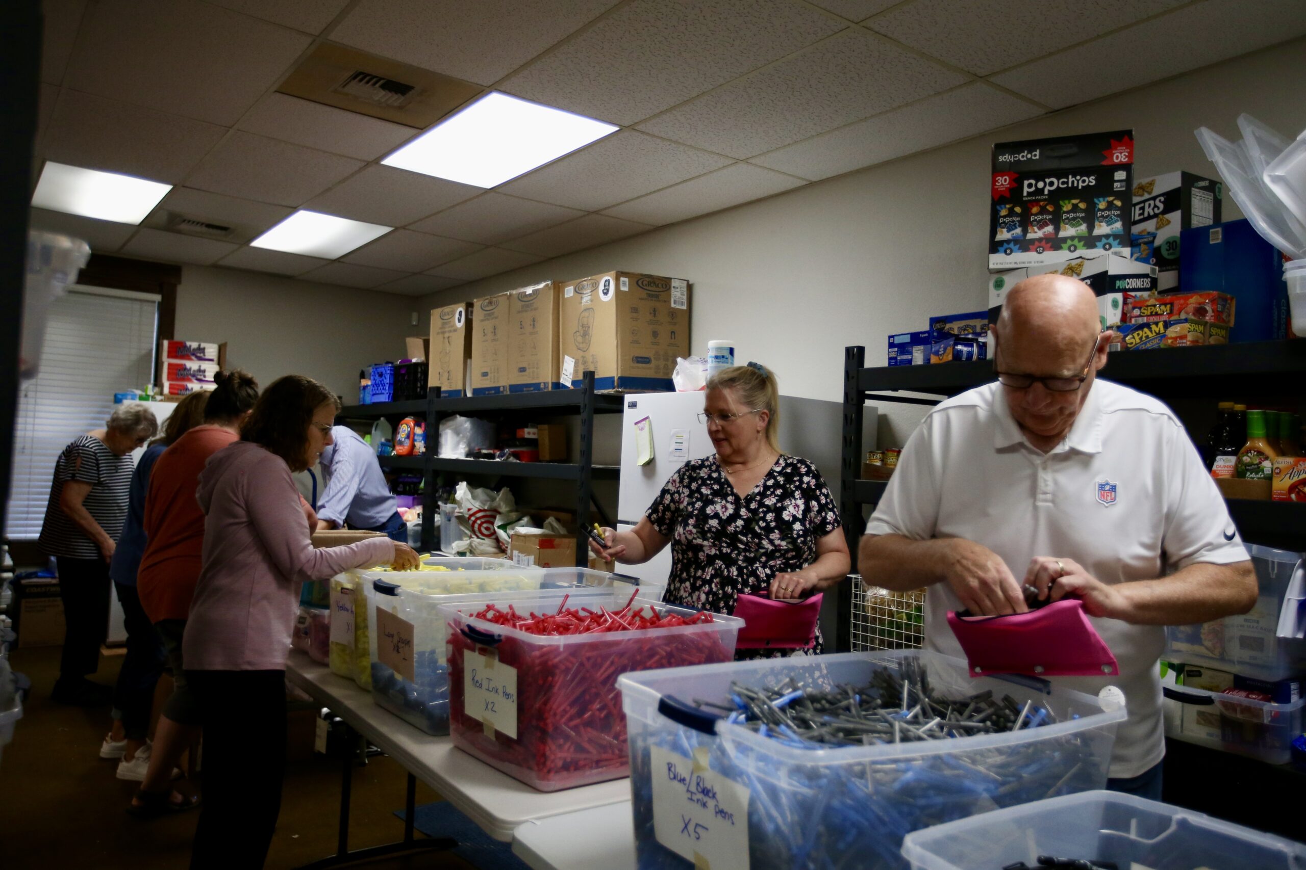During the backpacking party, volunteers lined up at a row of tables that had hundreds of pencil pouches, pens and erasers, among other supplies a student would need in a typical school year. The volunteers almost resembled a conveyor belt system.