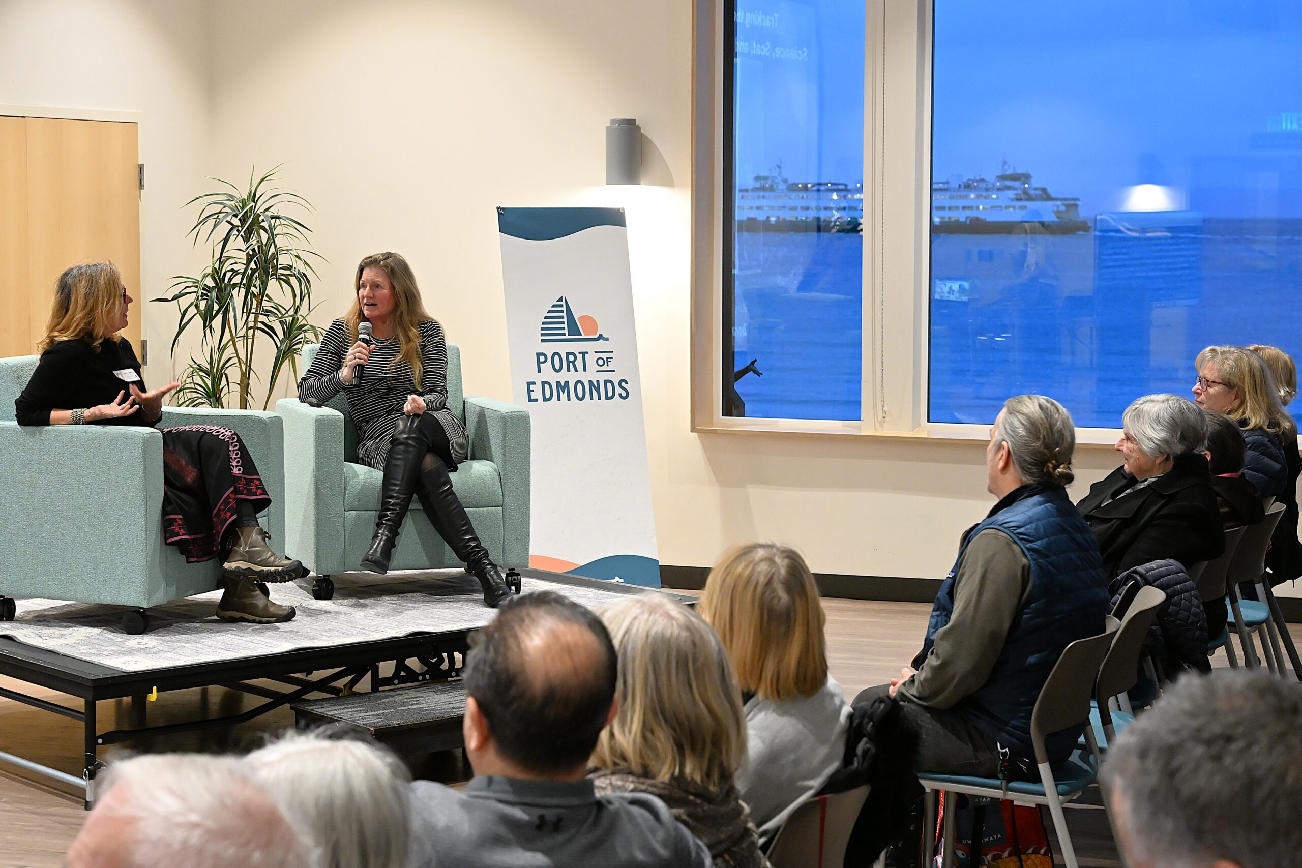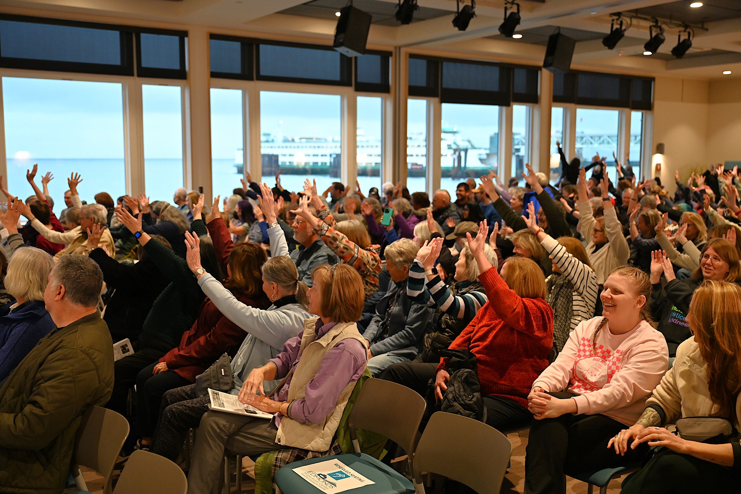 With the Salish Sea visible to the west, more than 200 people packed the Edmonds Waterfront Center auditorium March 12 to learn about how a well-trained dog nose and killer whale feces are unlocking crucial data about the health of Southern Resident killer whales (SRKW).