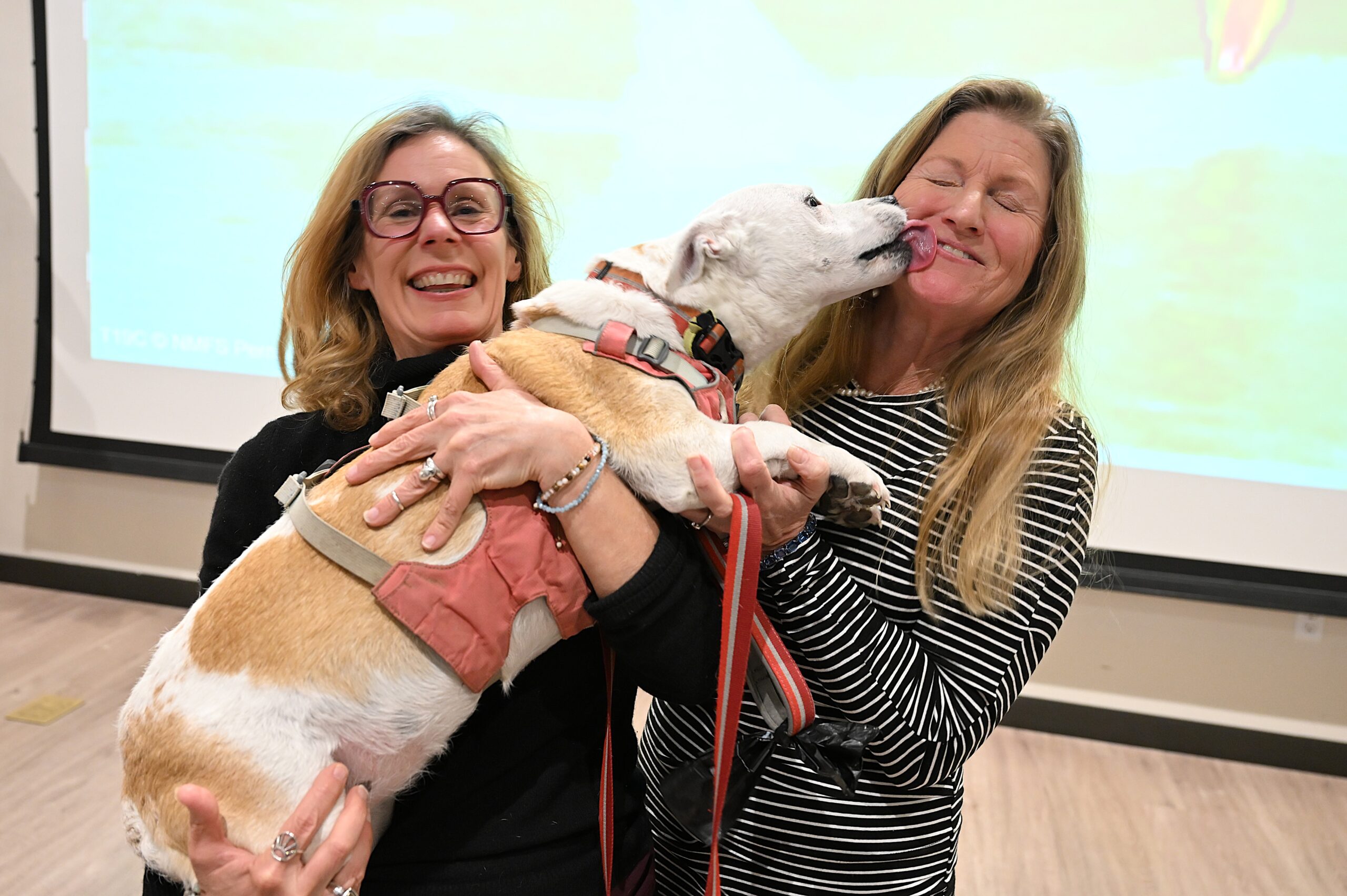 Giles’ canine research assistant, Eba “the whale dog,” was quietly sitting in the front row with Giles’ husband. Eba is a conservation dog who was professionally trained at UW to detect the scent of killer whale scat; since 2019 she has been an invaluable member of the whale scat detection team.