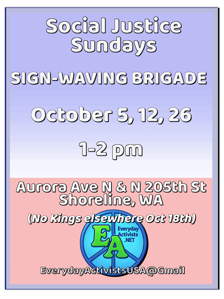 Peaceful activism on behalf of the Constitution, democracy, equality, and justice with sign-waving organized by Shoreline-based Everyday Activists continues: Oct. 26, 1-2 p.m., at the intersection of Aurora Avenue North and N. 205th Street, the Shoreline-Edmonds line.