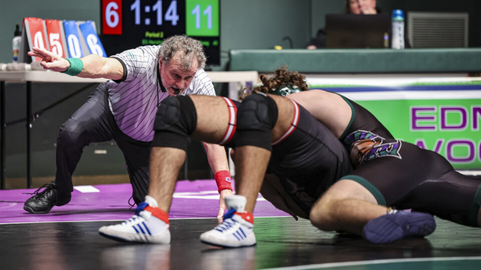 Edmonds-Woodway boys wrestling junior Alex Krumov and Mountlake Terrace sophomore Frank Guzman grapple in the 120-pound class during the Warriors – Hawks match Wednesday evening at the Edmonds-Woodway High School Great Hall. (Photos by Michael Bury)E-W senior Ben Wachira and Terrace junior Ekansh Verma meet in the 138-pound match.Warriors sophomore Owen Smith and Hawks sophomore Wyatt Hawkins compete at 144 pounds.E-W’s Dylan Rice and Terrace’s Fahad al Daffaie meet in the 150-pound match.Warriors sophomore Desmond Martin and Hawks senior Gregoriy Sharabov at 165 pounds.E-W junior Eli Hershey and Terrace sophomore Benjamin Wardak meet in the 190-pound match.The referee signals a near fall in the Hershey/Wardak match.Warrior Max Eldridge and Hawk Prince Udeogu meet at 215 pounds.