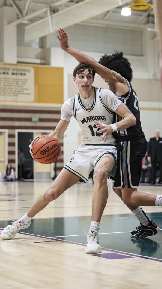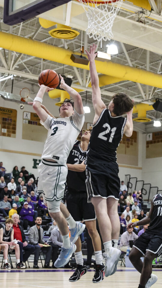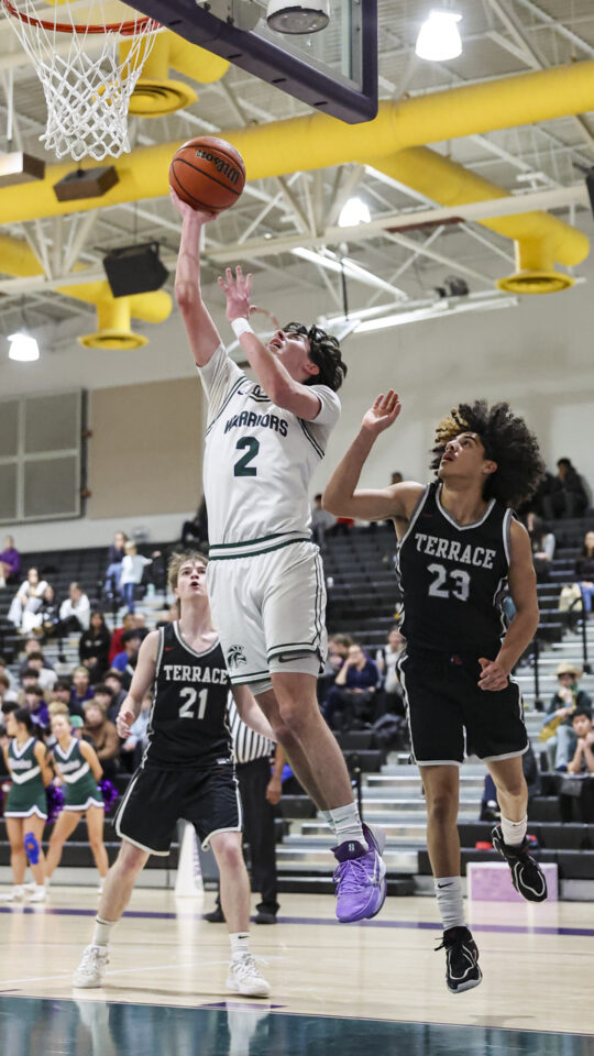 Edmonds-Woodway boys’ basketball senior Julian Gray (24) shoots over Mountlake Terrace sophomore Adam Desta (45) during the Warriors-Hawks game Thursday at the Edmonds-Woodway High School gym. (Photos by Michael Bury)Warriors senior Andreas Simonsen (2) elevates into the lane past Hawks sophomore Anthony Fuentes (23) for a shot.Warriors junior Grant Williams (3) shoots around Hawks senior Jordan Wilson (21).Warriors senior Cruz Escandon (1) defends the upcourt advance of Hawks freshman Tyree Connor (11).Hawks sophomore Chase Fleishman (41) brings down a rebound.Hawks freshman Tyree Connor (11) pushes through defending Warriors senior Andreas Simonsen (2).Warriors senior William Alseth (12) pushes into the lane against Hawks sophomore Anthony Fuentes (23).Warriors senior Dennis Karl (23) elevates for a layup against Hawks freshman Tyree Connor (11).Warriors senior Harris Dobson (25) rolls in a layup.Warriors junior Lincoln Bradford (0) flies in for a shot from outside the paint.
