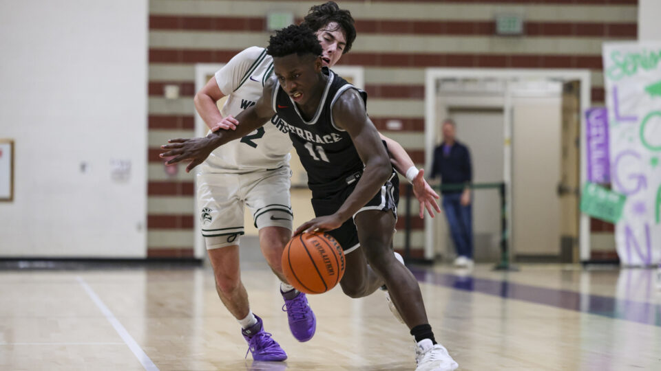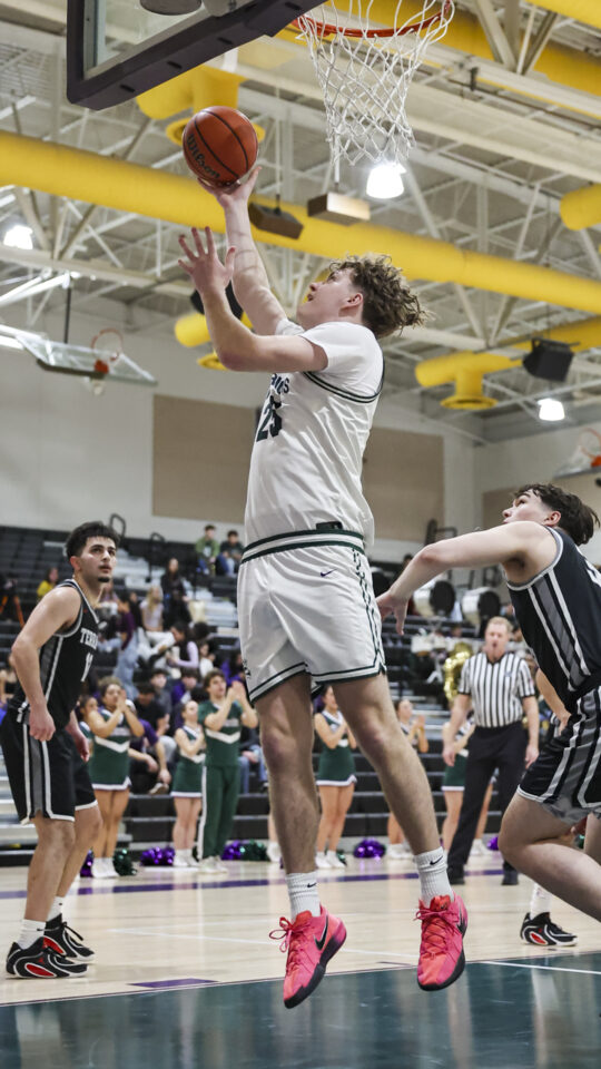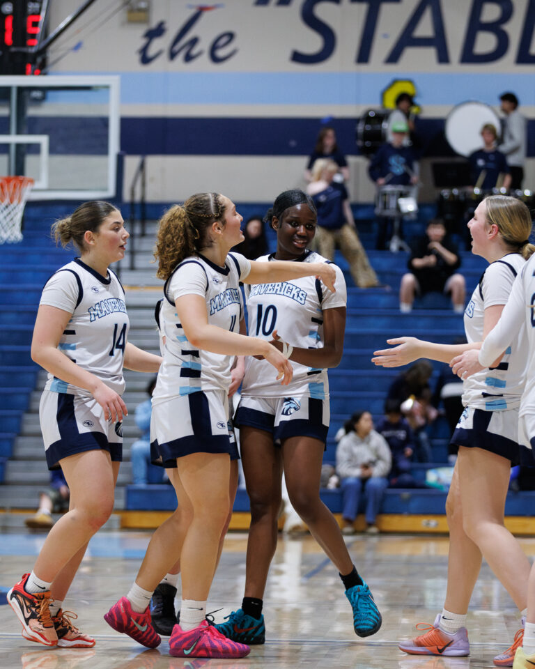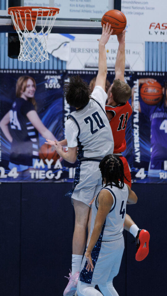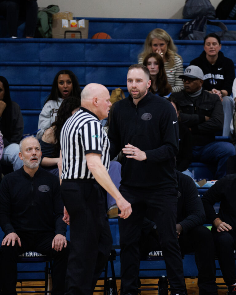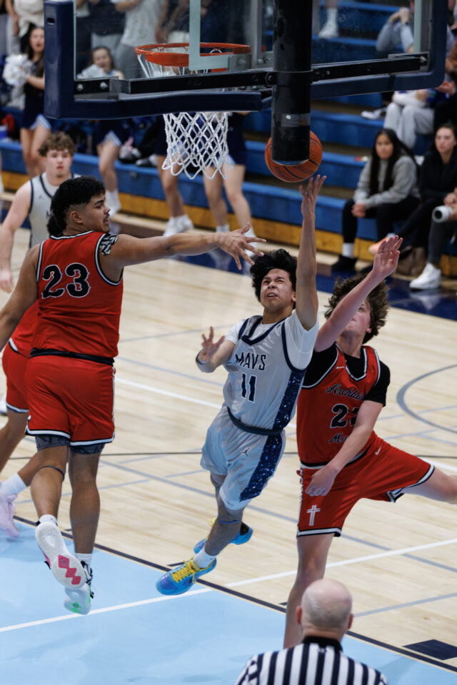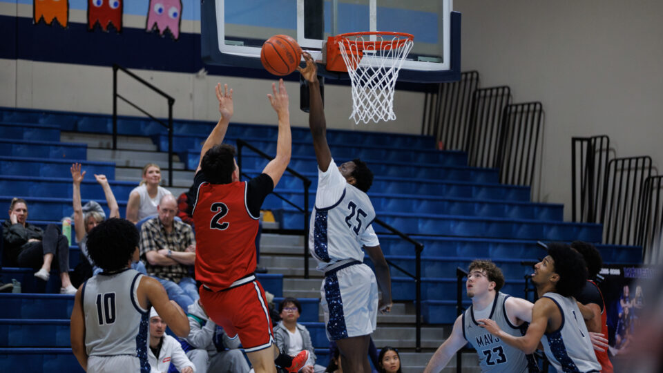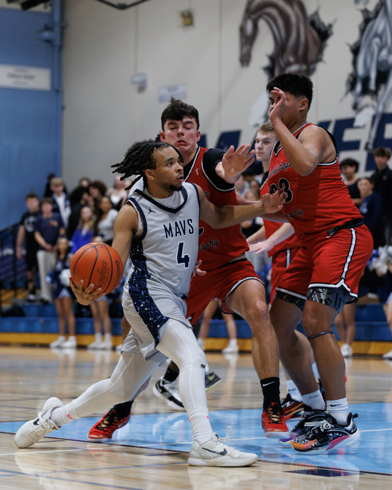 Meadowdale senior Orion Ezeonwuka (25) blocks Archbishop Murphy sophomore Cole Sievers’ (2) shot on Thursday, Jan. 29, at Meadowdale High School. (Photos by Andrew Robinson)Mavericks junior Nolan Lee (11) extends for a layup between Wildcats Vlad Bondarchuk (22) and Logan Fryberg (23).Meadowdale sophomore Hasaan Motley (4) attacks the lane against Archbishop Murphy defenders.Mavericks sophomore Parker Elliott (20) contests a shot by Wildcats senior Will Sears (11).Mavericks junior Marley Miller (23) finishes with his right hand over Wildcats senior Willie Sears (11).Meadowdale senior Noah Million (1) attacks the rim with his right hand.Meadowdale coach Roger O’Neill seeks clarification on shot-clock operations from a referee.