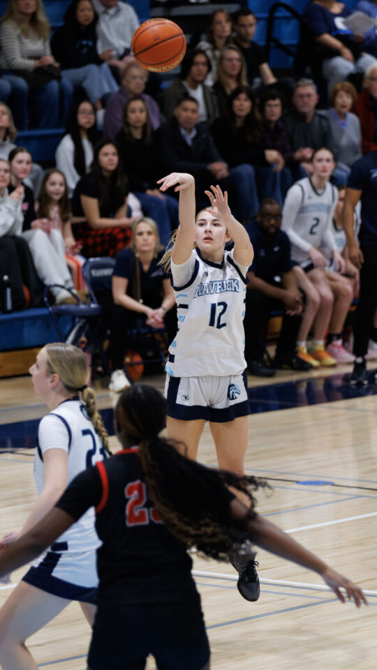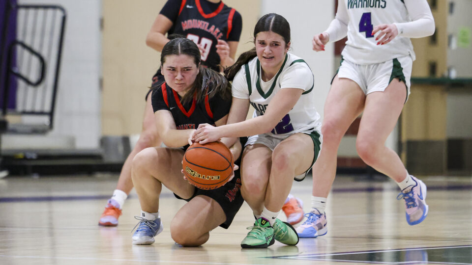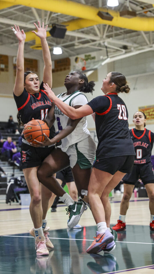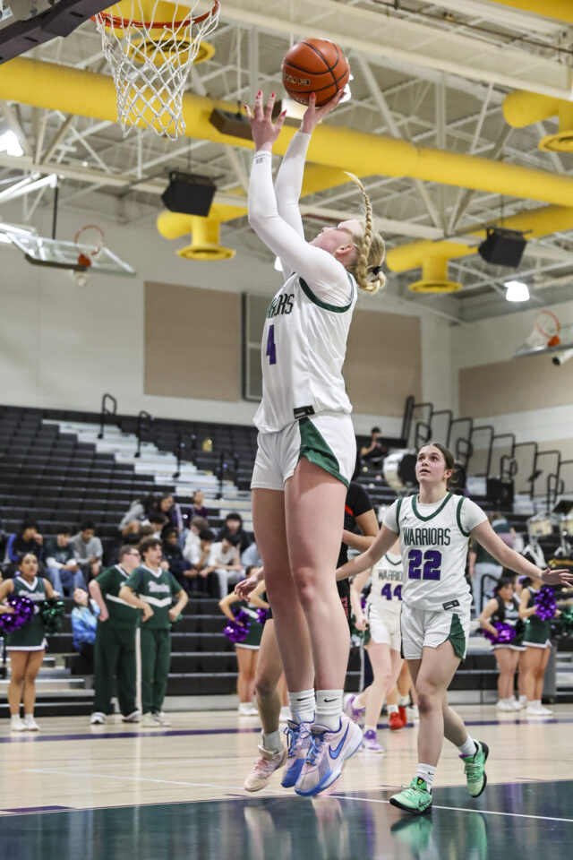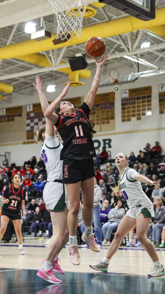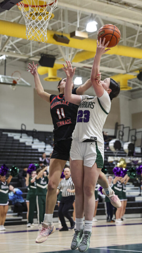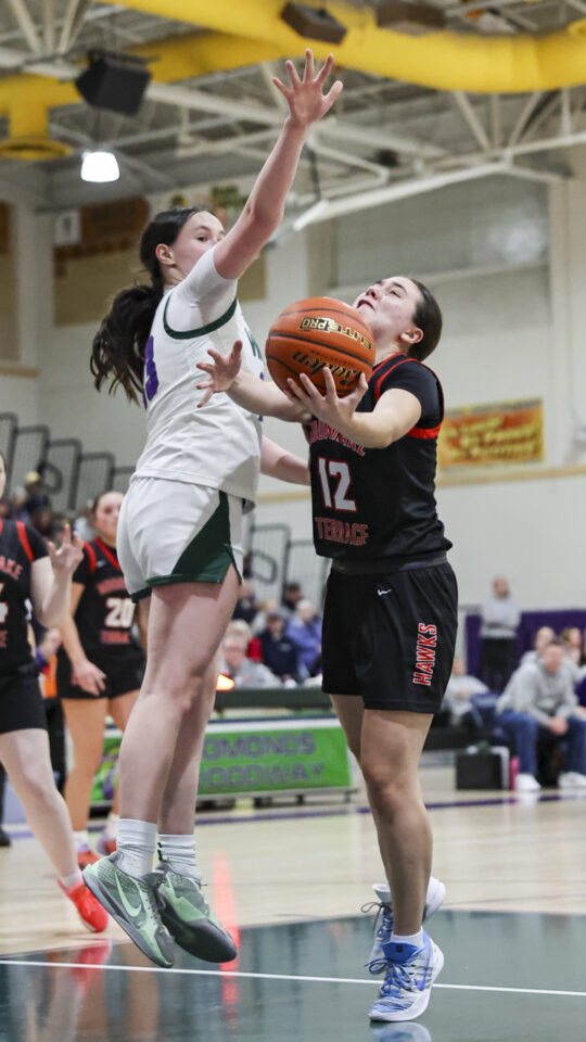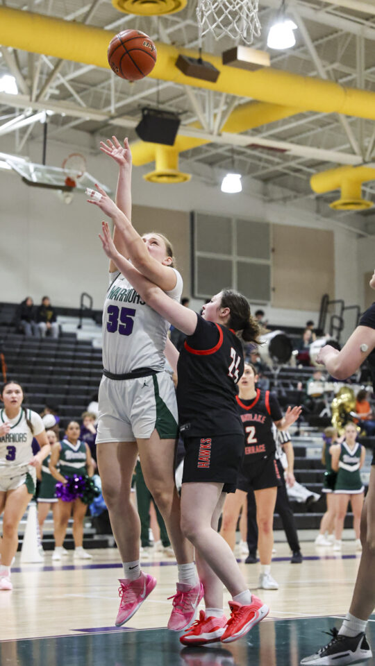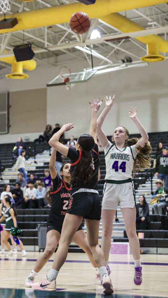 Edmonds-Woodway girls basketball freshman Amelia Faber (44) shoots over a late Mountlake Terrace double-team defense during the Warriors-Hawks game Thursday night at the Edmonds-Woodway High School gym. (Photos by Michael Bury)Warriors freshman Zaniyah Jones (2) splits the Hawks defense for a layup in the paint.Hawks junior Jordyn Stokes (20) grabs an errant pass headed for the lead referee.Warriors head coach Quinn Manning rallies her players during a first half time out.Hawks sophomore Makenna Davidson (11) goes up for a shot.Warriors senior Finley Wichers (4) shoots an uncontested layup after a steal and breakaway.Warriors freshman Sloane Franks (23) takes a shot and gets a foul from Hawks sophomore Makenna Davidson (11).Warriors freshman Amara Leckie (22) and Hawks senior Jordan Wagner (12) battle for a loose ball.Warriors senior Jane Hanson (1) splits the Hawks defense for a layup in the lane.Warriors senior Abigail Johnson (35) makes a shot over Hawks senior Brooklyn Marino (24).Hawks senior Jordan Wagner (12) shoots a lay-up under Warriors freshman Sloane Franks (23).