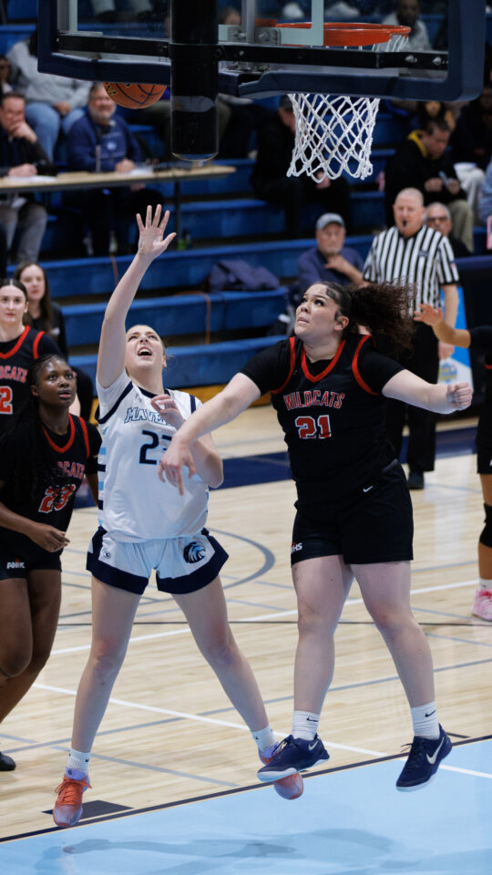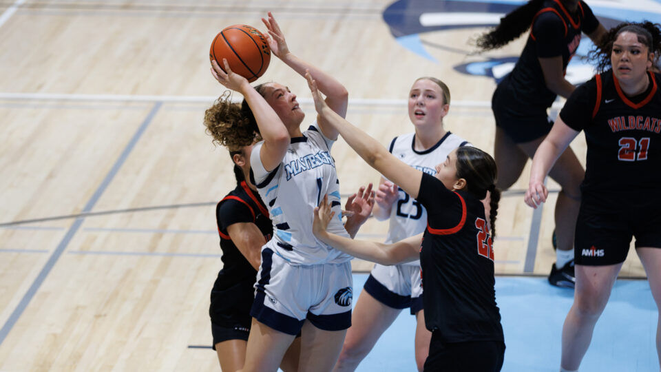 Meadowdale senior Mia Brockmeyer (11) shoots through contact against Archbishop Murphy junior Kyla Fryberg (22) on Thursday, Jan. 29 at Meadowdale High School. (Photos by Andrew Robinson)Meadowdale junior Lexi Zardis (12) scores three of her 24 points.Meadowdale sophomore Hannah Keeney (23) gets a shot up over Archbishop Murphy junior Celine Wright (21).Meadowdale junior Lisa Sonko (10) eyes the rim.Mavs senior Kylie Richards (left) pressures Wildcats senior Brooke Blachly (right).Mavs sophomore Charlotte Finnel (2) looks to pass the ball.Meadowdale junior Quinn Gannon (3) meets Archbishop Murphy senior Brooke Blachly (2) at half court.Meadowdale coach Benson Sims draws up a play during a timeout.The Meadowdale team celebrates its wire-to-wire victory.