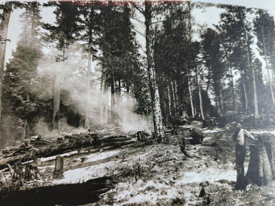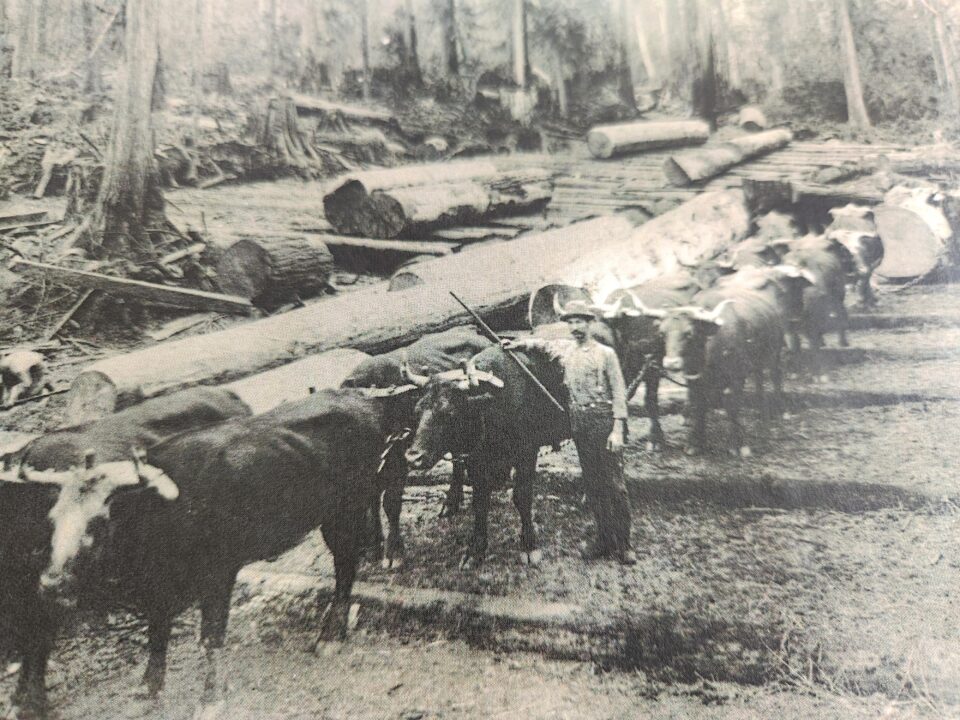 The “oiler” was tasked with this physically demanding and repetitive job. With a bucket of grease, they would walk ahead of the logging team, keeping the skids slick to make the work quicker and more efficient.