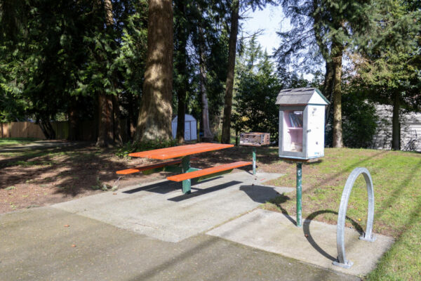 The park’s opening is on 58th Avenue West, across from St. Pius X Catholic Church. Visitors are greeted by a shaded picnic table, a mini library and a stand to lock their bikes.