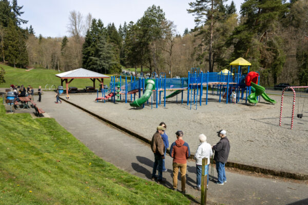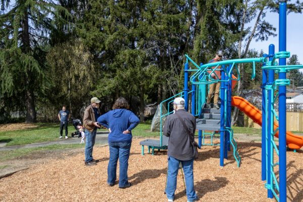 The group then took the quick walk down 58th Avenue West to Veterans Memorial Park’s upper plateau and playground, where Courtmanch explained the renovations planned for the grounds, including ADA accessibility.
