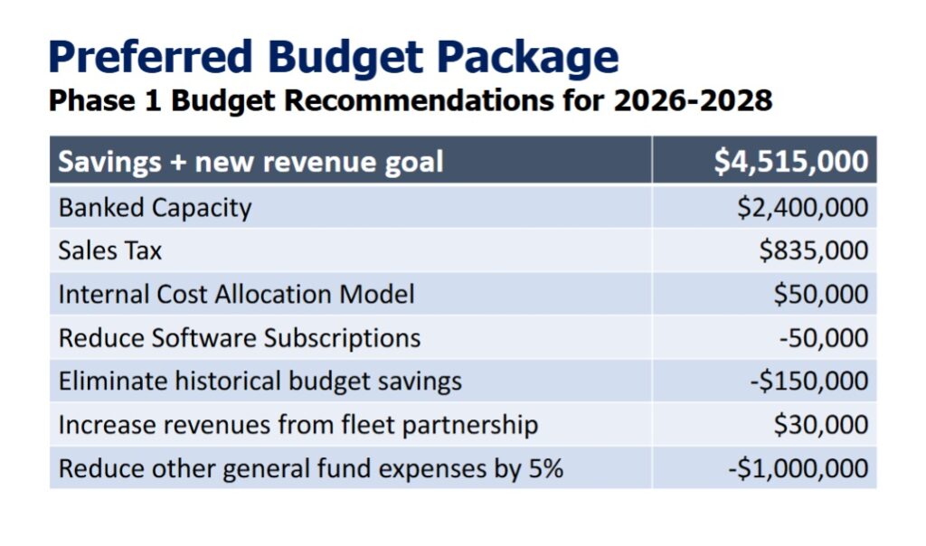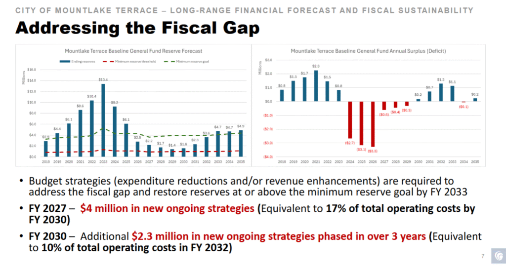 To close the gap and rebuild the reserves toward 20% – instead of their current 5% – the City needs $2 million to $4 million per year in expenditure reductions and/or new revenue. An additional $2.3 million per year is also needed starting in 2030, she added.