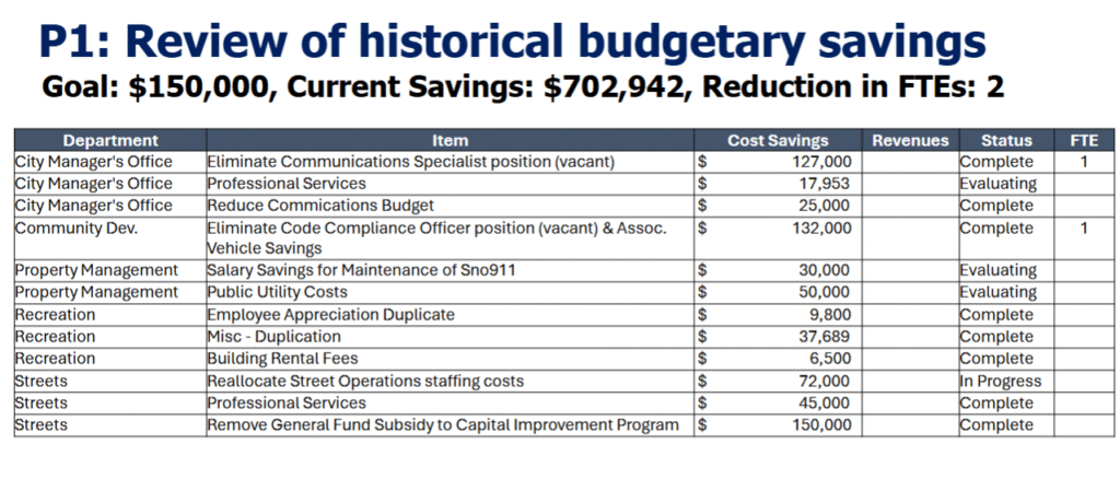 Niten highlighted budget strategies, including a reduction of “redundant” business management software subscriptions, a 5% general fund reduction over two years and potential tax measures, such as using the city’s banked property tax capacity or implementing a Transportation Benefit District sales tax.