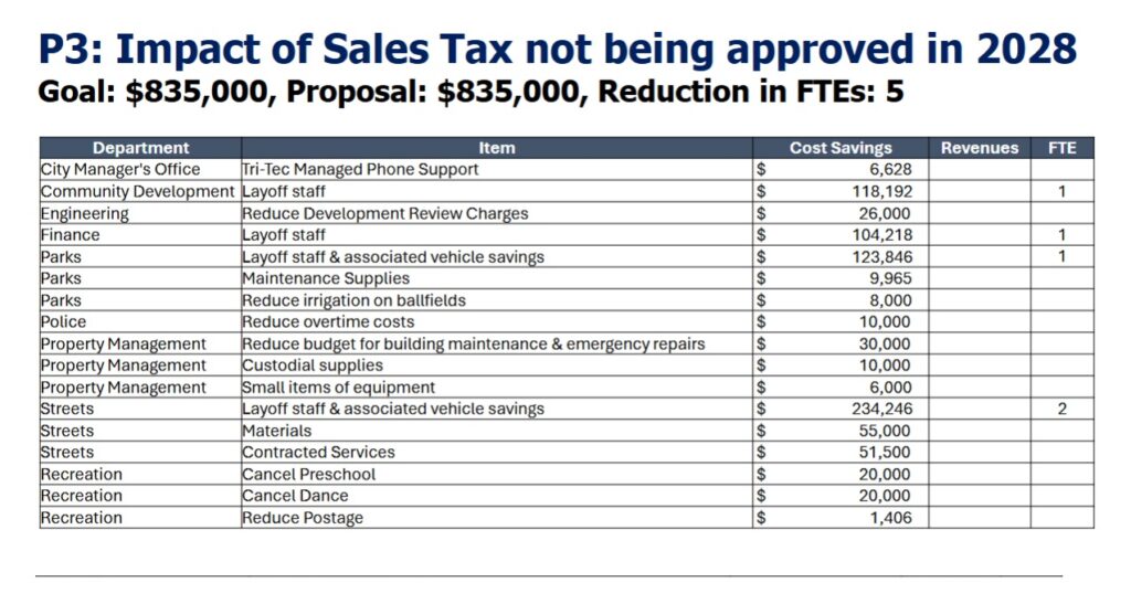 Phase 2 describes what would happen if the City does not take the full property‑tax banked capacity, which would bring in about $2.4 million. Hope said 12 full-time equivalents (FTE) would be reduced across multiple departments, which includes layoffs in the City Manager’s office, community and economic development, finance and parks and recreation.