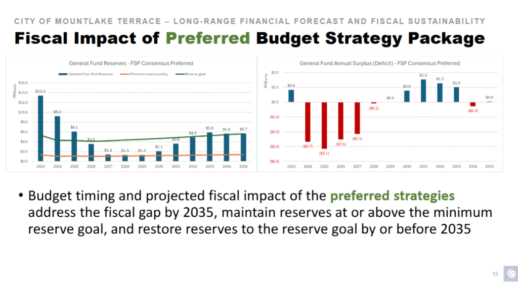 To close the gap and rebuild the reserves toward 20% – instead of their current 5% – the City needs $2 million to $4 million per year in expenditure reductions and/or new revenue. An additional $2.3 million per year is also needed starting in 2030, she added.