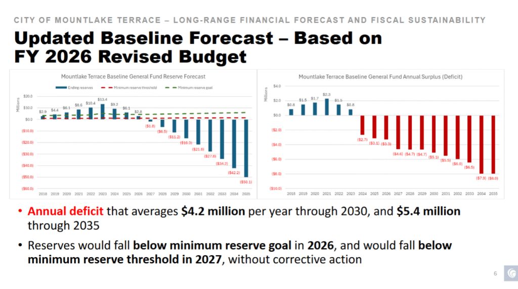 Hope said the task force based its recommendations on the City’s financial forecast from fall 2025, which shows an ongoing annual general fund deficit of about $4.2 million through 2030. This amount grows by about $5.4 million per year by 2035. Without corrective action, she noted the City’s reserves will drop below the minimum required threshold in 2027.