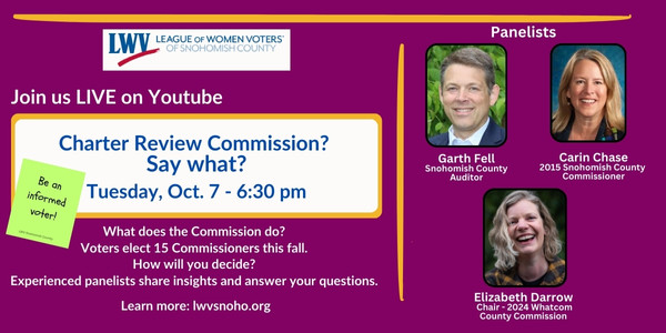 Charter Review Commissioners are on the ballot every 10 years. Voters will select three commissioners from each county district. Learn about the commission on the league’s YouTube Channel Livestream at 6:30 p.m. Tuesday, Oct. 7. Speakers include Garth Fell, Snohomish County auditor; Carin Chase, 2015 Snohomish County Commissioner; and Elizabeth Darrow, chair, 2024 Whatcom County Commission. A recording will also be available.