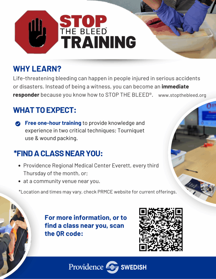 Yes, I want to support My MLTnews!Life-threatening bleeding can happen in people injured in serious accidents or disasters. Learn how to “stop the bleed” during a free one-hour training starting from 2-3 p.m. Thursday, Jan. 15 at Providence Regional Medical Center in Everett.