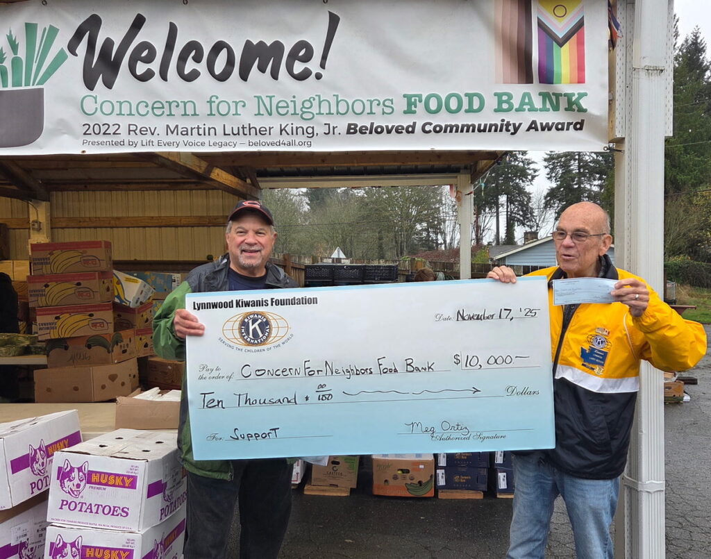 The Lynnwood Kiwanis Foundation recently donated $10,000 to Concern for Neighbors Food Bank in Mountlake Terrace. The club also donated $10,000 each to Lynnwood Food Bank and Edmonds Food Bank.