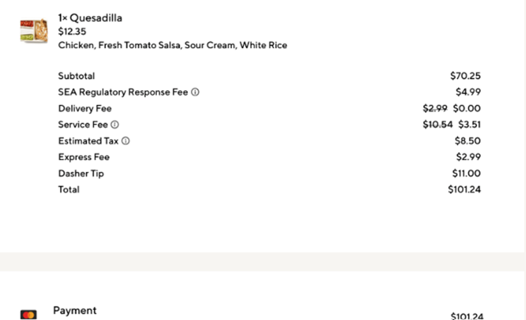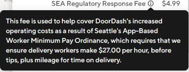 The SEA (Seattle) Regulatory Response Fee is the fee added to delivery services in response to the City of Seattle’s App-Based Worker Minimum Payment Ordinance, commonly referred to as the “PayUp” ordinance implemented in January 2024. The ordinance ensures that app-based delivery workers earn at least $27 per hour. It includes time and distance components requiring delivery companies to pay drivers at least 44 cents per minute and 74 cents per mile with a minimum payment of $5 per delivery.