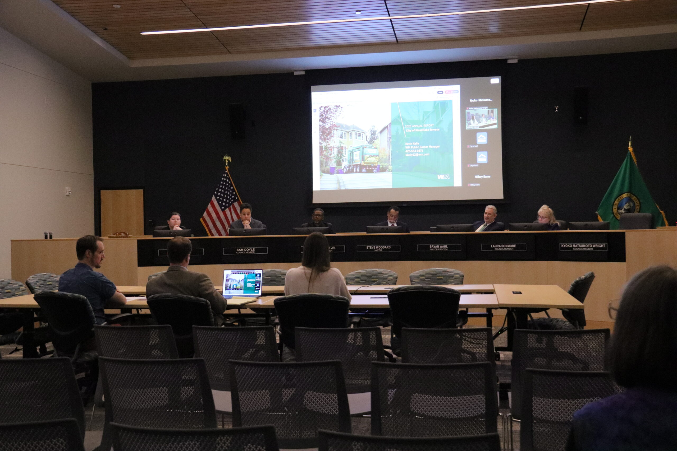 The Mountlake Terrace City Council at its March 19 meeting heard an annual report from Waste Management, which has a solid waste contract with the City. Public Sector Manager Kevin Kelly and Education and Outreach Coordinator Grace Fletcher highlighted customer service communication improvements, new garbage truck technology and billing issues.