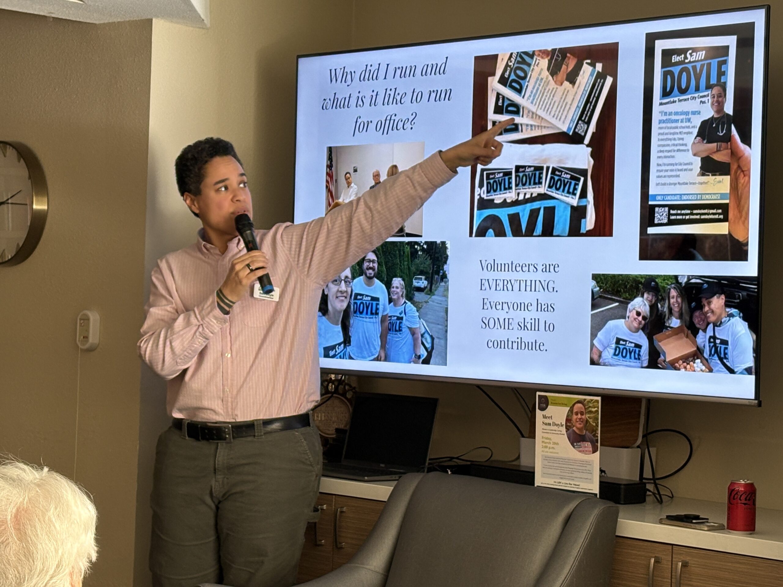 Councilmember Sam Doyle spoke recently to residents of MBK-Mountlake Terrace Plaza Senior Living in celebration of Women’s History Month. Doyle shared her journey to being elected in November 2025 as the first Black woman on the Mountlake Terrace City Council.