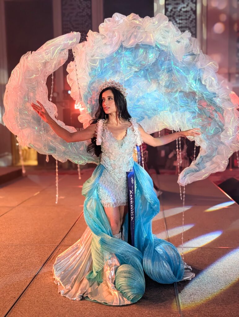During the costume presentation, Shifali delivered a visual narrative about Earth’s climate crisis. America is home to the world’s second-largest collection of glaciers — ice formations now disappearing at an alarming rate due to rising global temperatures. Using the pageant as her platform, Shifali said she sought to awaken awareness about environmental degradation. Her outfit conveyed this urgent message: a halo crafted as a glacier mountain represented nature’s majesty, while her dress of cascading icicles transformed into flowing water, symbolizing the sea level rise that increasingly threatens coastal populations worldwide.