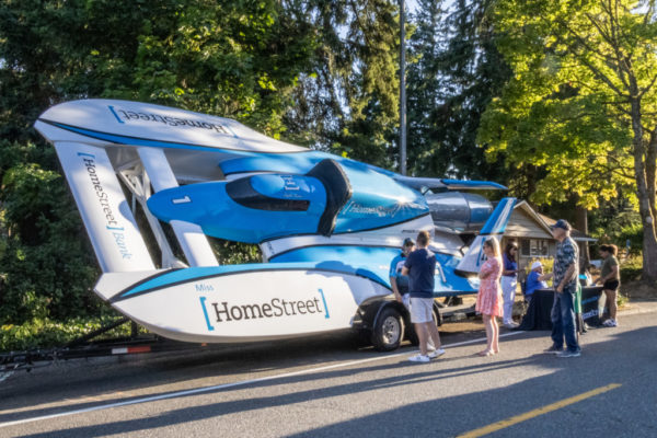 Dylan Runne, the driver of HomeStreet Bank’s “Miss HomeStreet,” describes to guests what it’s like to pilot a hydroplane.
