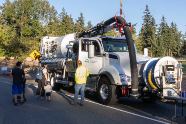 Pictured center in the yellow high-visibility work shirt, Marco Di Moretti of Mountlake Terrace’s Public Works shows off the newest of the city’s three water maintenance trucks — one for water, sewer and stormwater shown here. He explained that the giant vacuum removes debris to prevent flooding.