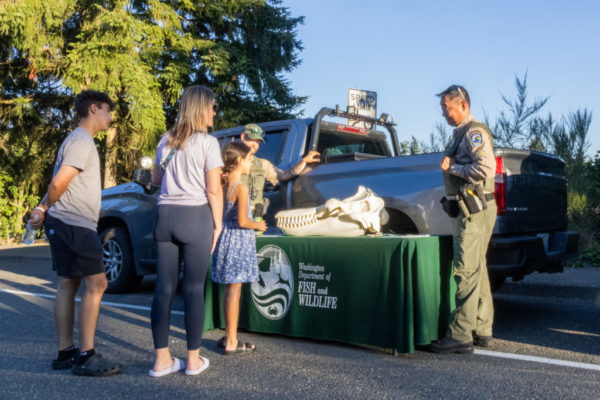 State Department of Fish and Wildlife Officers Nick Libbing and Hwa Kim show attendees a replica of an orca skull, one of Puget Sound’s most cherished native species, along with the Chinook, coho, chum, pink and sockeye salmon they feed on.