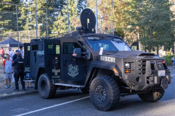 Though children ask about the BearCat’s armor, the adults ask about the mileage. Officer Mike Padgett explains that the roughly 5,000 pounds of armor plating requires a heavy-duty V8 turbo diesel engine. According to Lenco documents, it gets an average of 10-12 mpg and should not be driven above 25 mph.