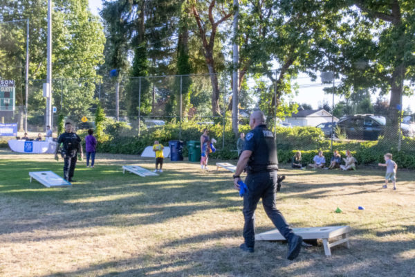 Detective David Nguyen and Officer Chuck Elrod play a beanbag toss game with neighborhood children during Mountlake Terrace’s National Night Out.
