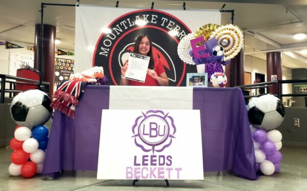 Mountlake Terrace High School honored senior Ellery Garrett earlier this week as she signed her letter of intent to play soccer at Leeds Beckett University this fall in Leeds, England.