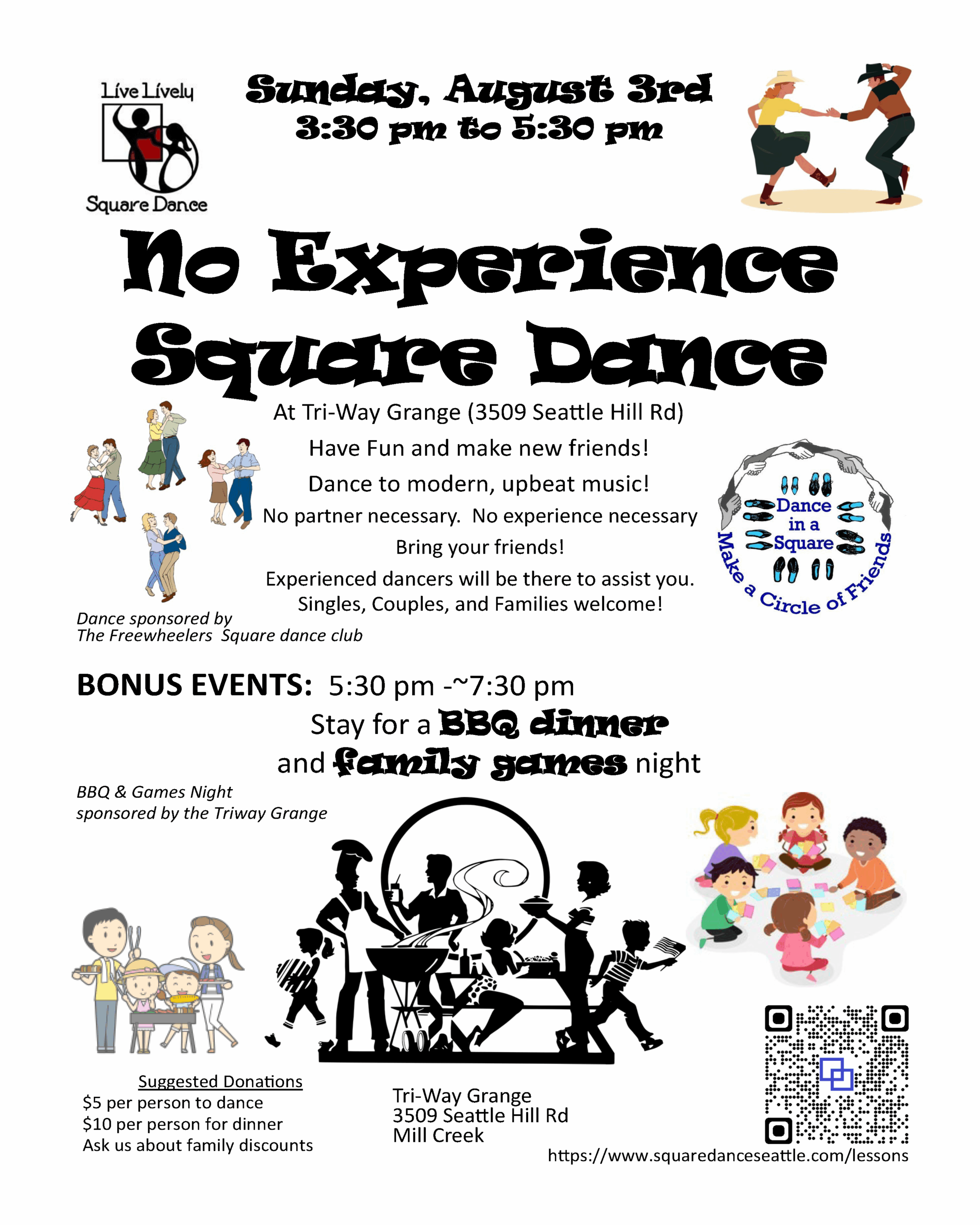 The Freewheelers Square Dance Club is sponsoring a No Experience Square Dance from 3:30-5:30 p.m. Sunday, Aug. 3 at Tri-Way Grange in Mill Creek.