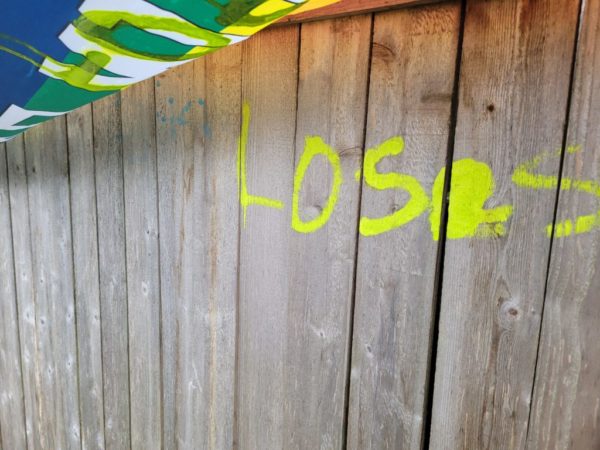 Meier’s Pride banner reading, “Love Always Wins,” was defaced with what appears to be the words “bitch loses” written in blue and yellow spray paint, bleeding through the nylon and into the wooden fence behind it.