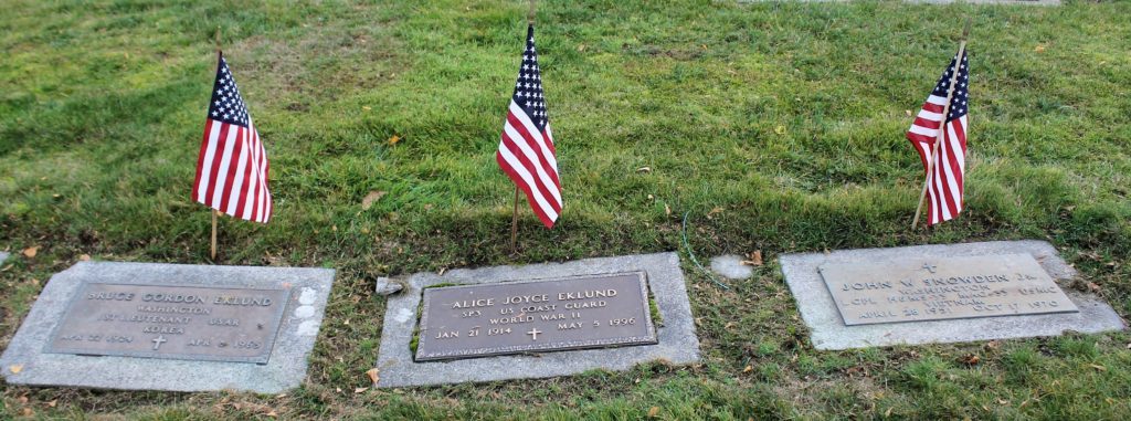 The gravesites of three veterans who served in three different branches of the US Armed Services (from left-to-right, Army Reserve, Coast Guard and Marine Corp) and in three different wars (Korean, World War II and Vietnam).