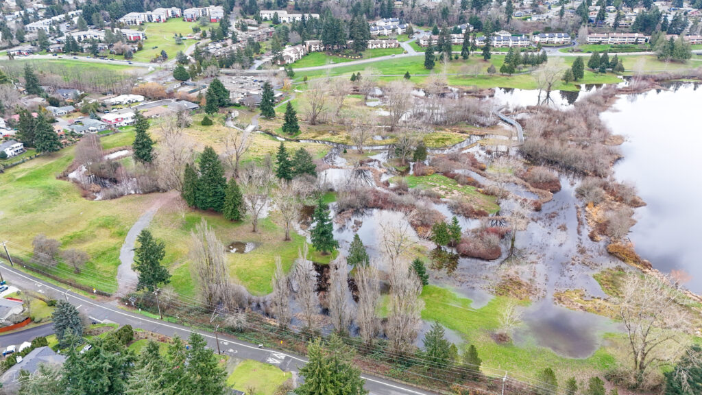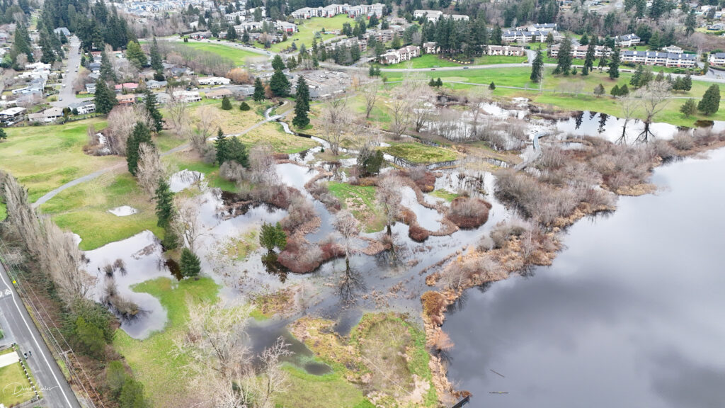 David Carlos takes monthly photographs and video via drone to capture the progress of the fish and wildlife restoration project at Ballinger Park. A partnership between the U.S. Army Corps of Engineers and the City of Mountlake Terrace, the project includes planting of more than 2,000 native trees and shrubs, redirecting Hall Creek to a new, more-stable channel, and constructing boardwalks, trails and footpaths.