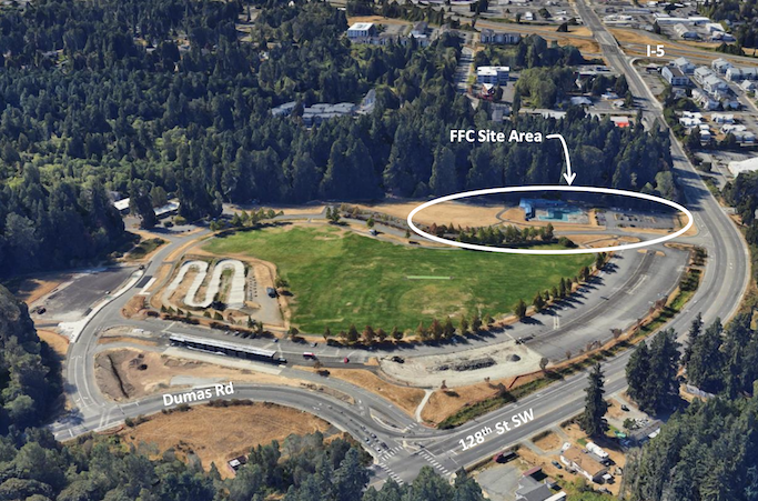 McCollum Park was chosen in part due to its proximity to Interstate 5, which makes it easily accessible to trucks transporting food products to and from the facility. The FCC will be sited in the park’s northwest section, requiring the removal of a swimming pool. Future phases will include removal or renovation of the two WSU Extensions buildings, a new playgroundand site improvements near the Northwest Stream Center.