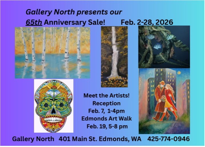 Join us at Gallery North in Edmonds, for a special celebration marking the cooperative’s 65th anniversary. From Feb. 2-28, experience a vibrant collection of artworks by 17 talented member artists and artisans, offered at discounted prices as part of our Anniversary Sale.